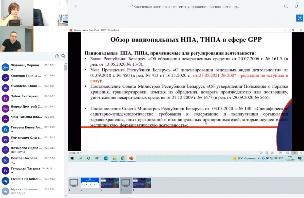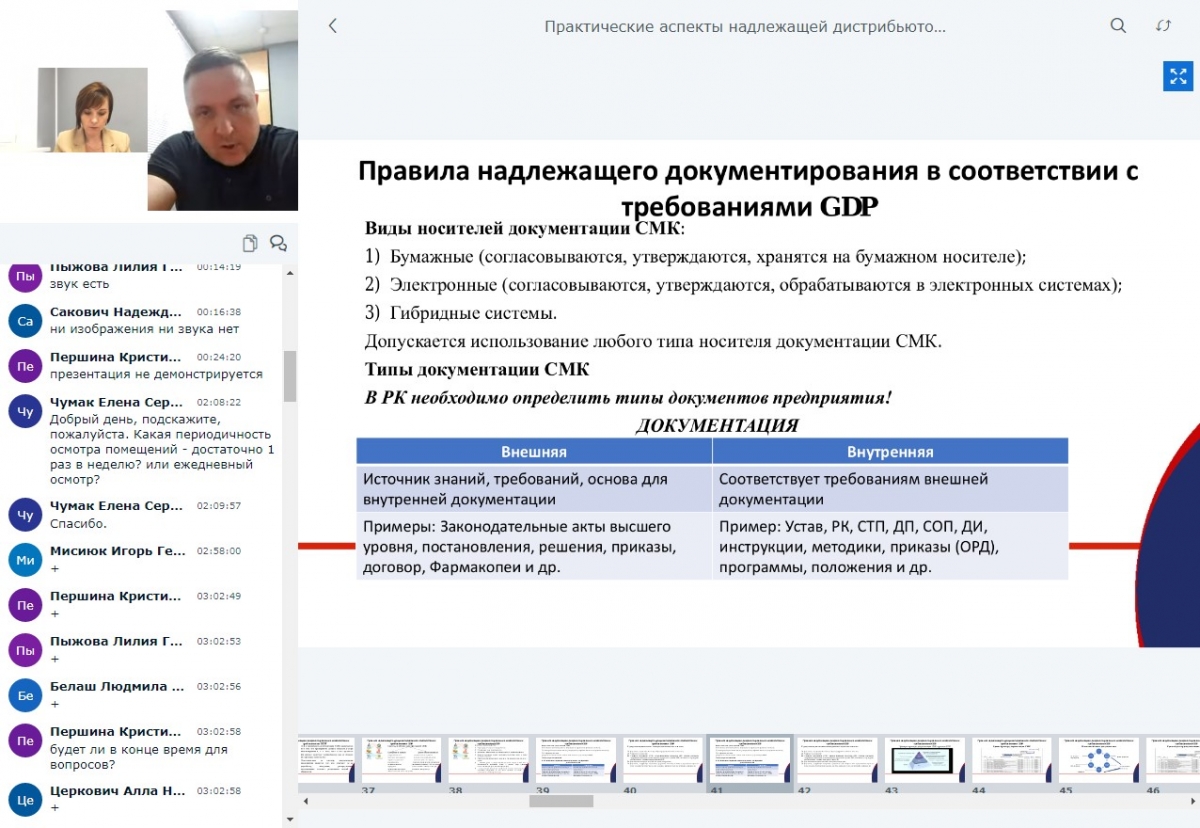 Дистанционно на онлайн-семинаре присутствовали специалисты предприятий учавствующих в цепи поставок екарственных средств таких как : ООО «Интерофицина», ООО «ЛКЛ», ООО «БАЛЬЗАМ», ООО «ПИЛЮЛЯ», ОДО «Доминантафарм», ООО ПКФ «Ясса», ООО «Здоровое решение», УП «ФАРМ ФОРУМ»,  ООО «Фарммаркет-плюс», ООО «Управляющая компания холдинга «Аптека групп», Гомельское РУП «Фармация», ОДО «СалюсЛайн», ОДО «Квэрк», ООО «Аптекарь», УП «МедФармИнвест», ОДО «ДКМ-ФАРМ».