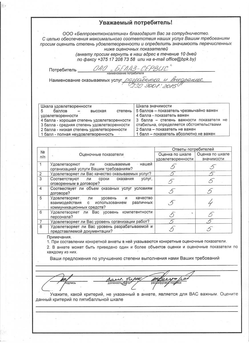 Анкета удовлетворенности ОАО "БЕЛАЗ-СЕРВИС"