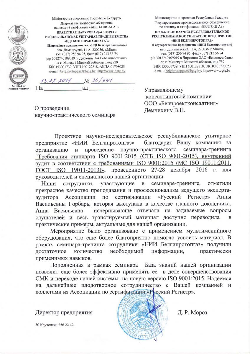 Проектное научно-исследовательское республиканское унитарное предприятие «НИИ Белгипротопгаз» благодарит Вашу компанию за организацию и проведение научно-практического семинара-тренинга "Требования стандарта ISO 9001:2015 (СТЬ ISO 9001-2015), внутренний аудит в соответствии с требованиями ISO 9001:2015 (МС ISO 19011:2011, ГОСТ ISO 19011-2013)», проведенного 27-28 декабря 2016 г. для руководителей и специалистов нашей организации.