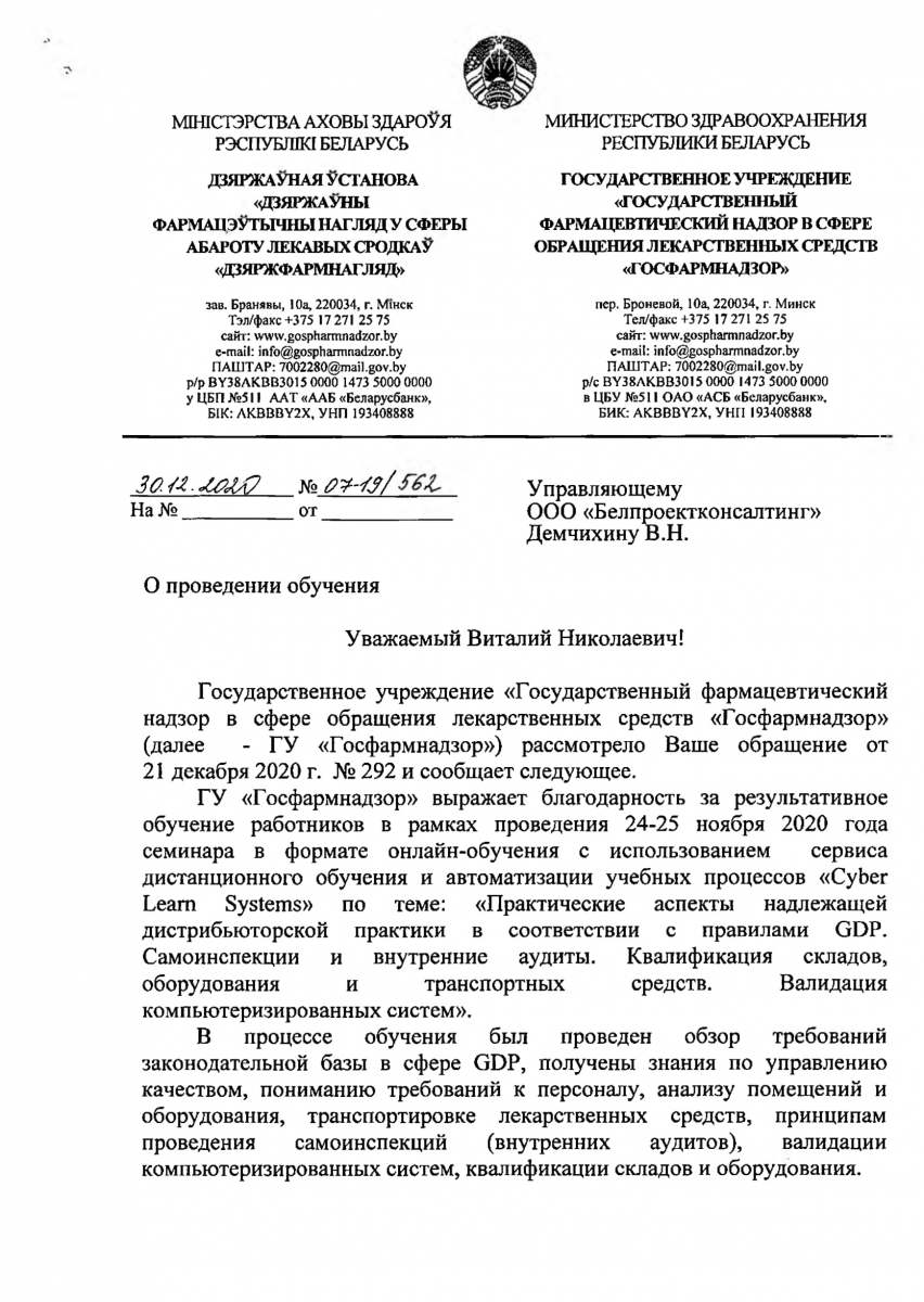 ГУ «Госфармнадзор» выражает благодарность за результативное обучение работников в рамках проведения 24-25 ноября 2020 года семинара в формате онлайн-обучения с использованием сервиса дистанционного обучения и автоматизации учебных процессов «Cyber Learn Systems» по теме: «Практические аспекты надлежащей дистрибьюторской практики в соответствии с правилами GDP. Самоинспекции и внутренние аудиты. Квалификация складов, оборудования и транспортных средств. Валидация компьютеризированных систем».