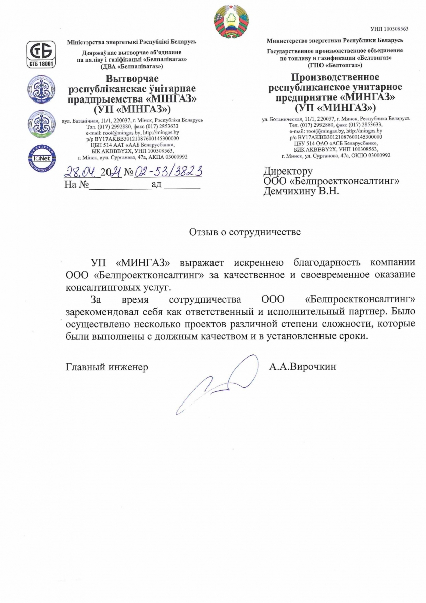 УП «МИНГАЗ» выражает искреннею благодарность компании ООО «Белпроектконсалтинг» за качественное и своевременное оказание консалтинговых услуг. За время сотрудничества ООО «Белпроектконсалтинг» зарекомендовал себя как ответственный и исполнительный партнер. Было осуществлено несколько проектов различной степени сложности, которые были выполнены с должным качеством и в установленные сроки.