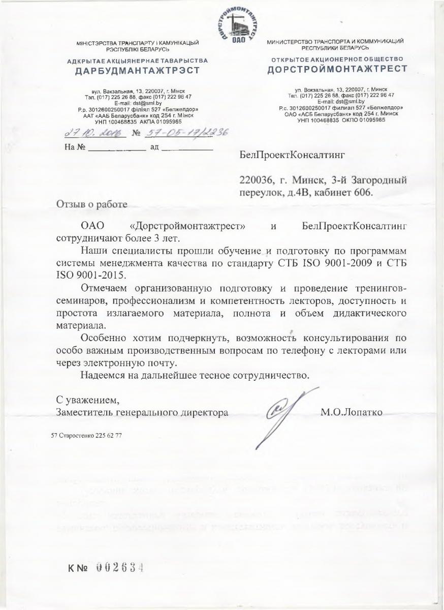 ОАО «Дорстроймонтажтрест» и ООО «БелПроект Консалтинг» сотрудничают более 3 лет.