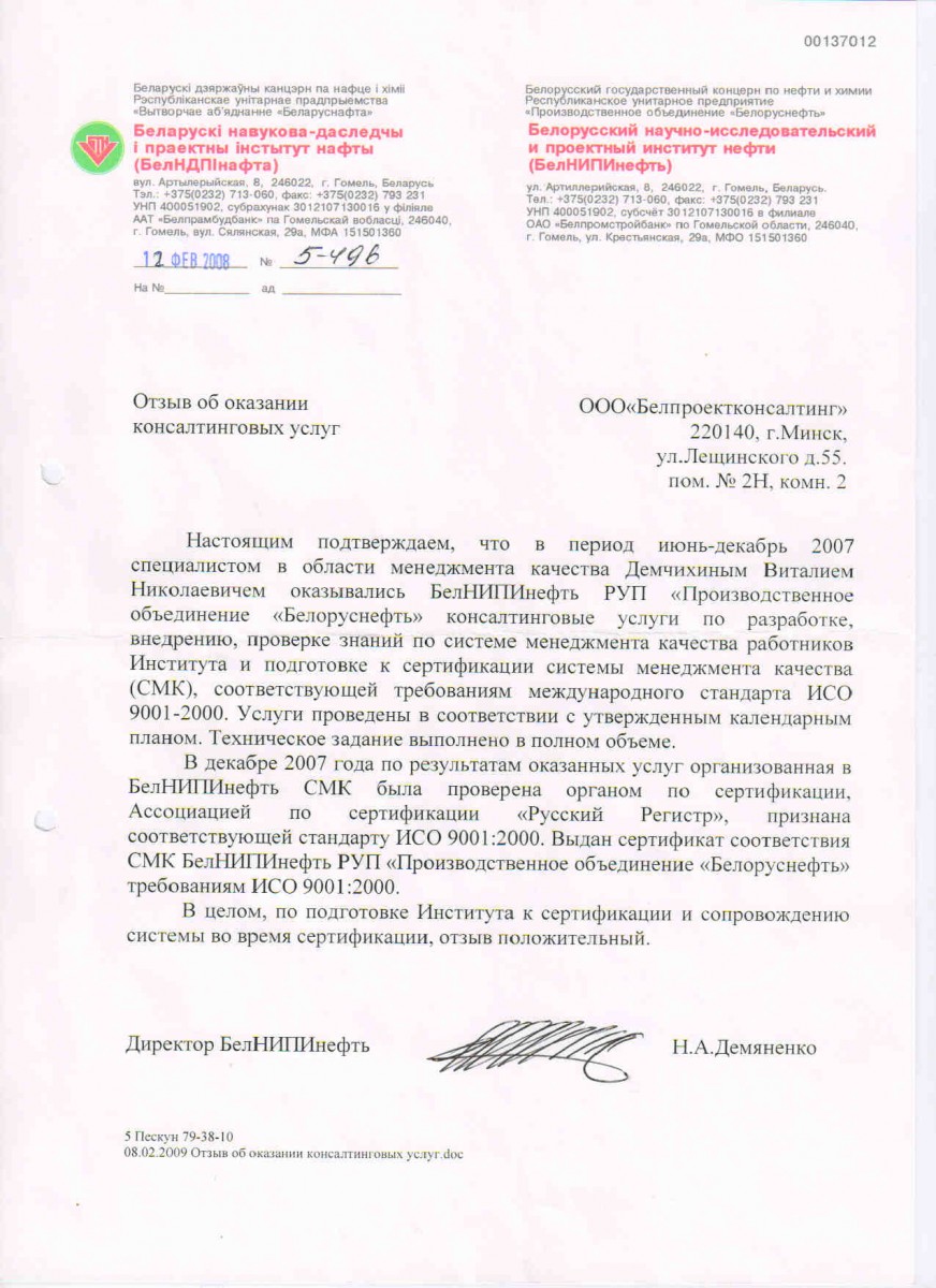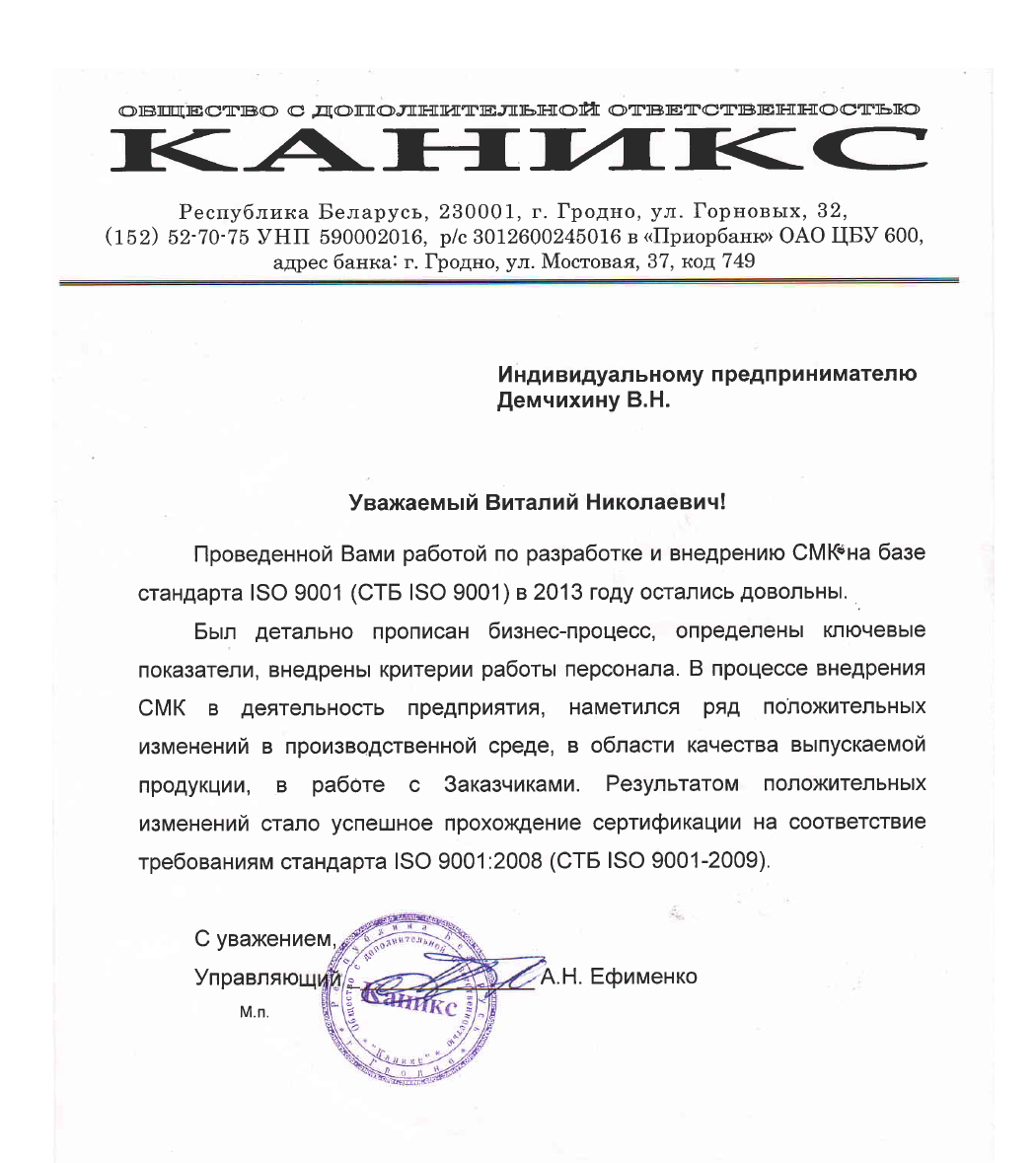 Директору консалтинговой компании «БелПроектКонсалтинг» Демчихину В.Н.