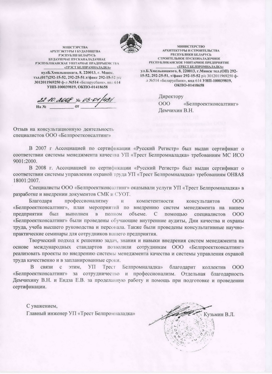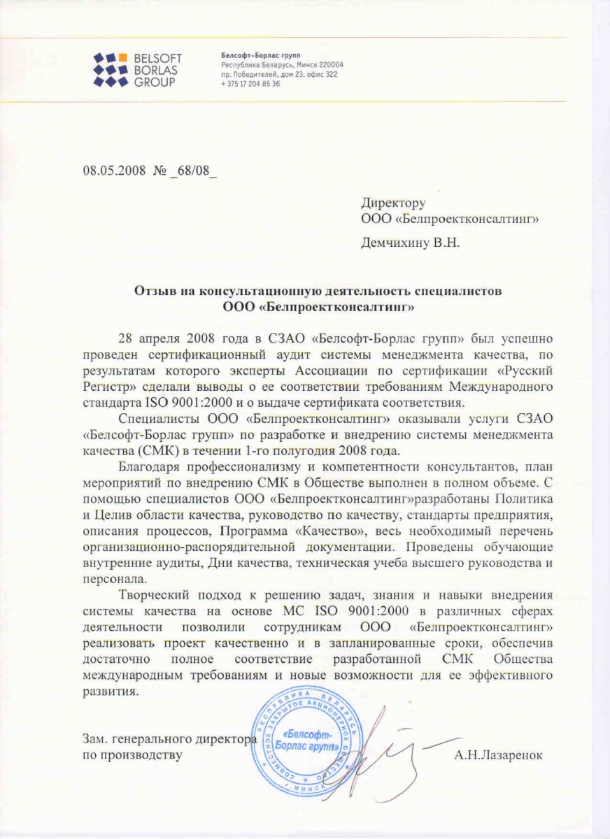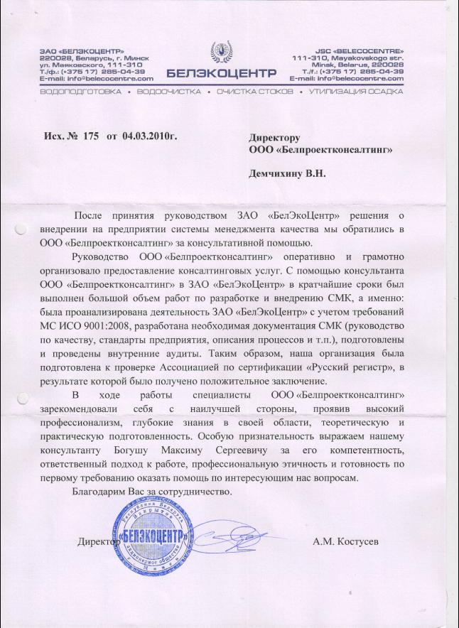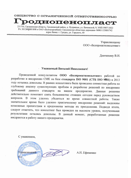 Мы полностью удовлетворены результатами работы специалистов компании ООО «БелПроектКонсалтинг» и можем рекомендовать всем, кто заинтересован в разработке и внедрению систем менеджмента на своих предприятиях.