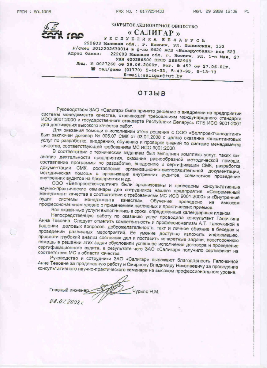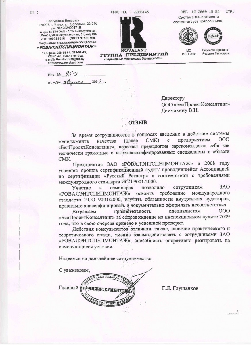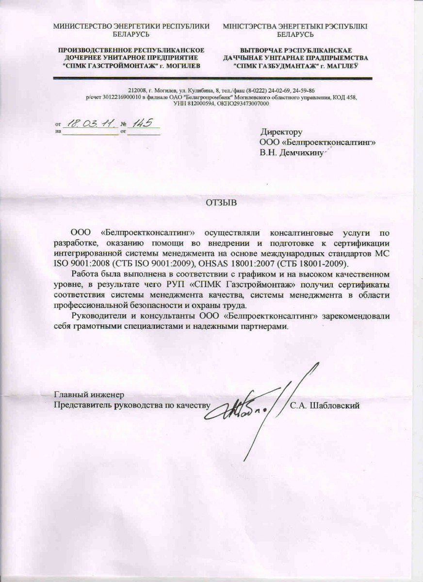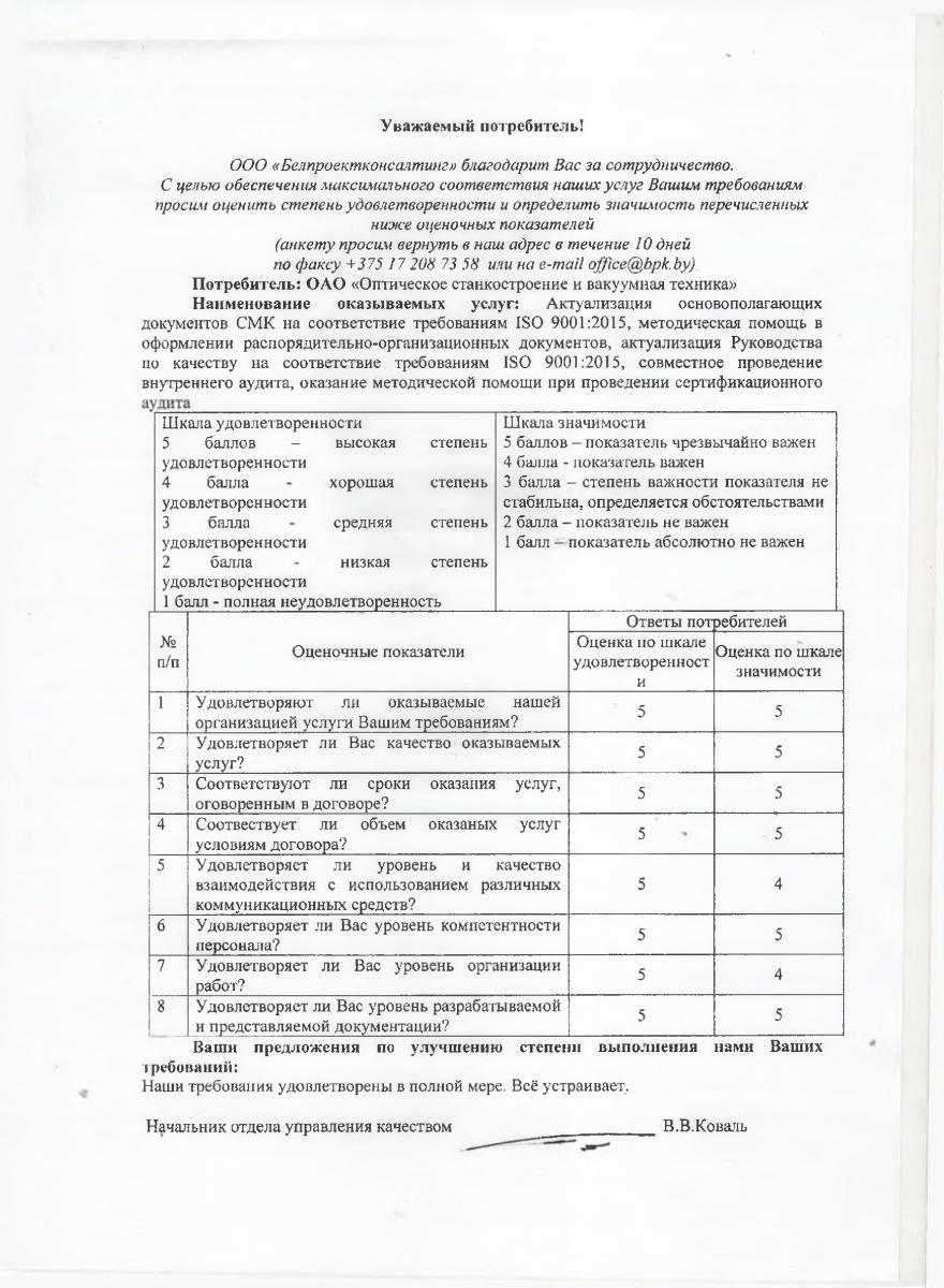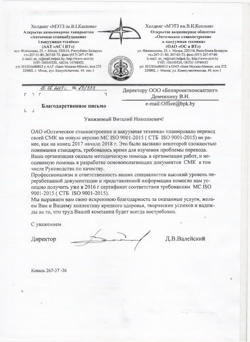ОАО «Оптическое станкостроение и вакуумная техника» планировало перевод своей СМК на новую версию МС ISO 9001-2015 ( СТБ ISO 9001-2015) не ранее, как на конец 2017 начале 2018 г. Это было вызвано некоторой сложностью понимания стандарта, требовалось время для изучения проблемы перехода. Ваша организация оказала методическую помощь в организации работ, и неоценимую помощь в разработке основополагающих документов СМК в том числе Руководства по качеству. Профессионализм и ответственность ваших специалистов высокий уровень переработанной документации и представленной информации помогло нам успешно получить уже в 2016 г сертификат соответствия требованиям Mc Iso 9001-2015 (СТБ ISO 9001-2015). Мы выражаем вам свою искреннюю благодарность за оказанные услуги, желаем Вам и Вашему коллективу крепкого здоровья, творческих успехов и надежды на то, что труд Вашей компании будет всегда востребован.
