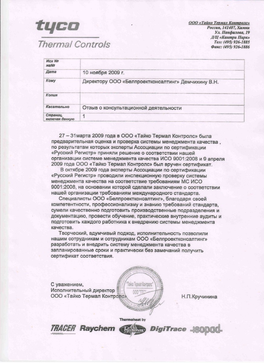 Высокий уровень квалификации ваших сотрудников, хорошо разработанная документация и грамотные консультации - все это позволило выполнить поставленные задачи по созданию и сертификации СМк в Национальной системе сертификации.