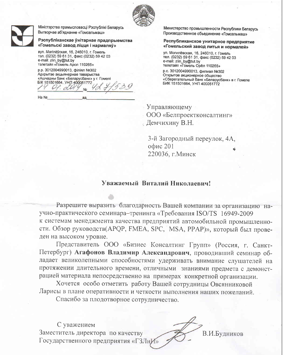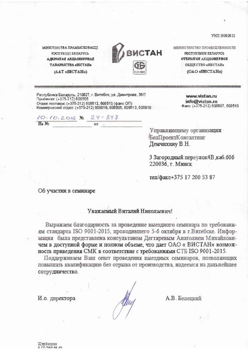 Выражаем благодарность за проведение выездного семинара по требованиям стандарта ISO 9001-2015, проходившего 5-6 октября в г. Витебске. Информация была представлена консультантом Дегтяревым Анатолием Михайловичем в доступной форме и полном объеме, что дает ОАО «ВИСТАН» возможность приведения СМК в соответствие с требованиями СТБ ISO 9001-2015.