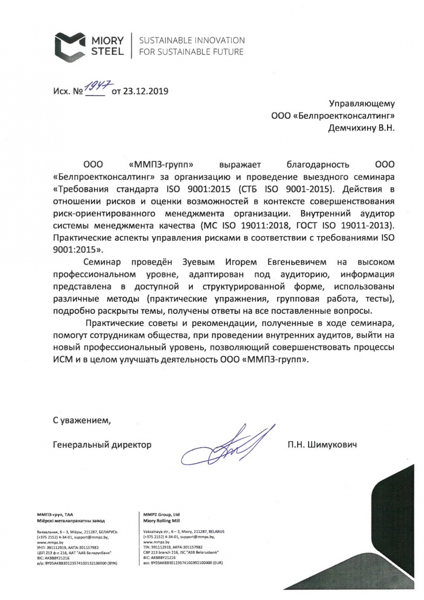 ООО «ММПЗ-групп» выражает благодарность ООО «Белпроектконсалтинг» за организацию и проведение выездного семинара «Требования стандарта ISO 9001:2015 (СТБ ISO 9001-2015). Действия в отношении рисков и оценки возможностей в контексте совершенствования риск-ориентированного менеджмента организации. Внутренний аудитор системы менеджмента качества (MC ISO 19011:2018, ГОСТ ISO 19011-2013). Практические аспекты управления рисками в соответствии с требованиями ISO 9001:2015».