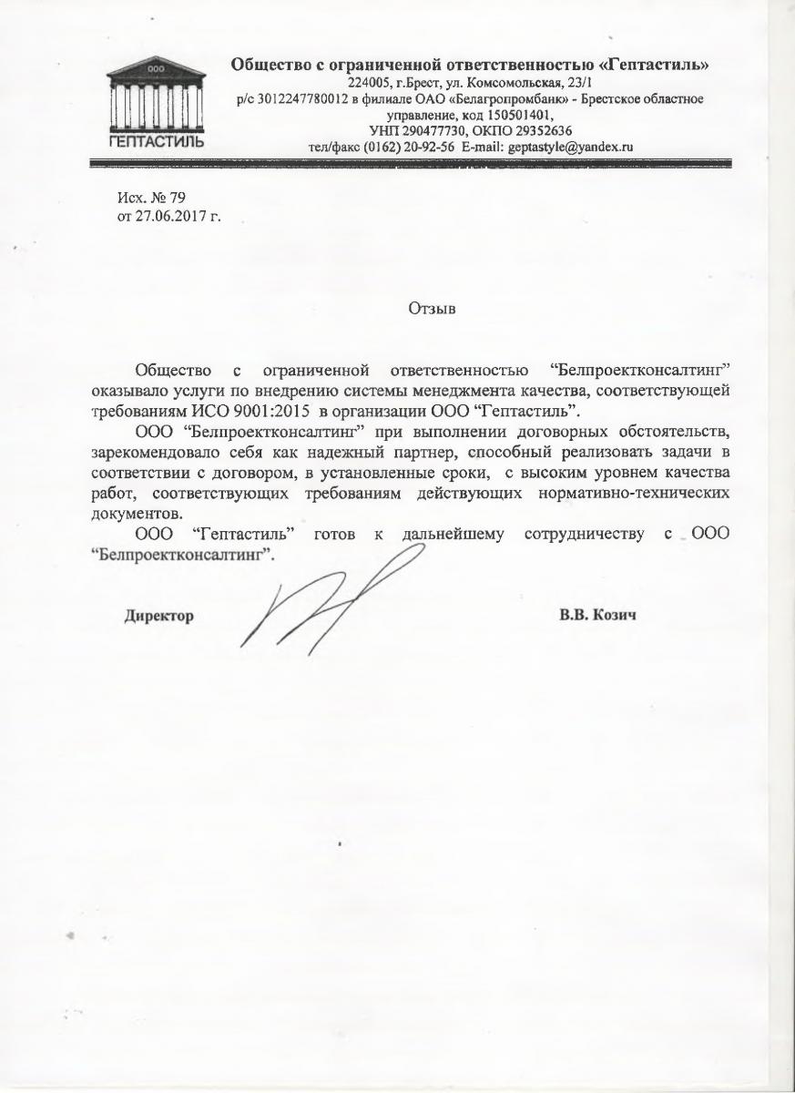 ООО “Гептастиль” готов к дальнейшему сотрудничеству с ООО “Белпроектконсалтинг".