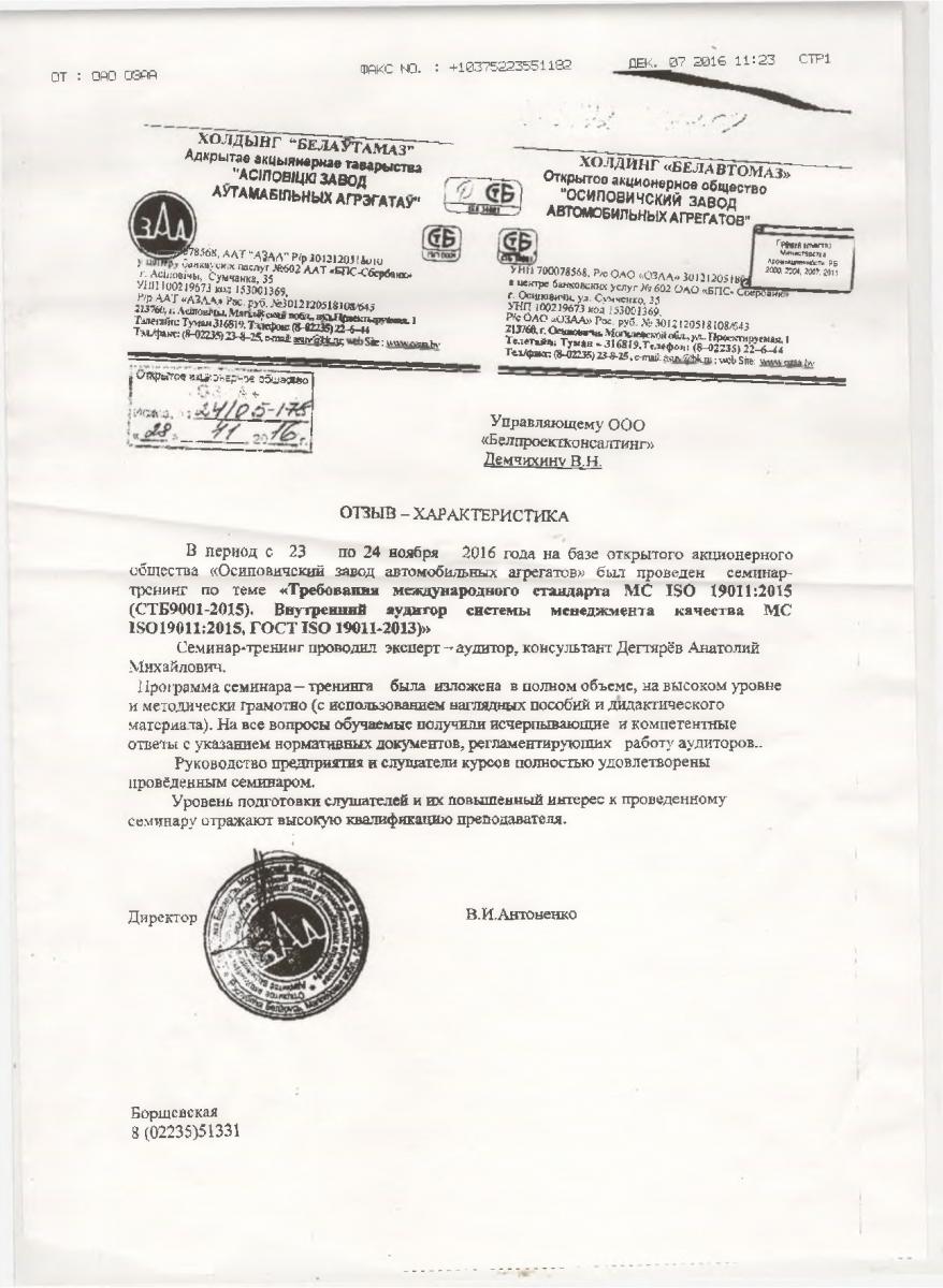 В период с 23 по 24 ноября 2016 года на базе открытого акционерного общества «Осиповичский завод автомобильных агрегатов был проведен семинартренинг по теме «Требовании международного стандарта ISO 19011:2015 (СТБ9001-2015). Внутренния аудитор системы менеджмента качества ISO19011:2015, ГОСТ ISO 19011-2013)»