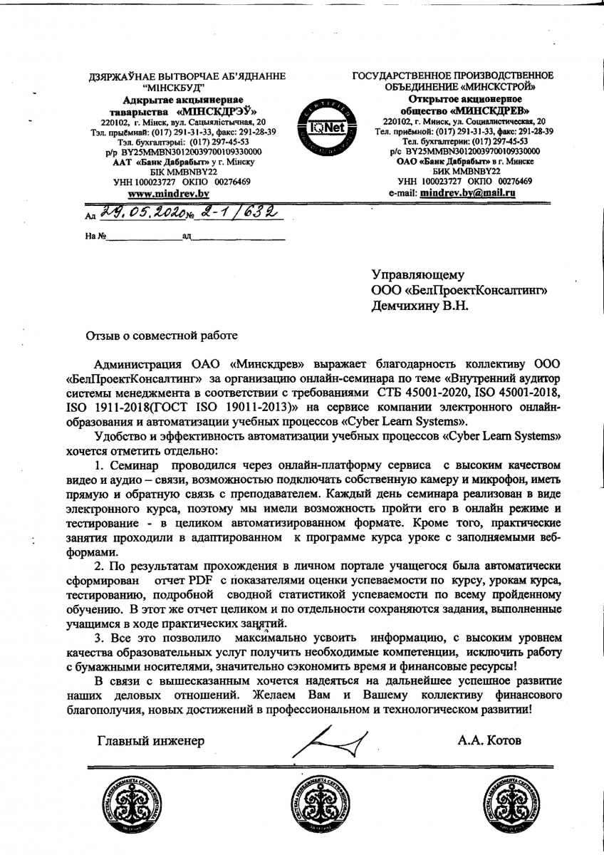 Администрация OAO «Минскдрев» выражает благодарность коллективу ООО ‹БелПроектКонсалтинг» за организацию онлайн-семинара по теме «Внутренний аудитор системы менеджмента в соответствии с требованиями СТБ 45001-2020, ISO 45001-2018, ISO 1911-2018(ГОСТ ISO 19011-2013)» на сервисе компании электронного онлайн- образования и автоматизации учебных процессов «Cyber Learn Systems». Удобство и эффективность автоматизации учебных процессов «Cyber Learn Systems» хочется отметить отдельно: