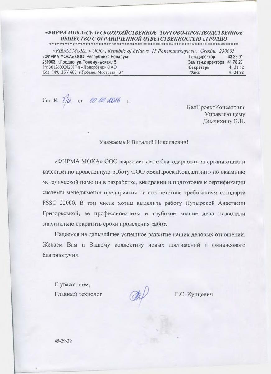 ООО «ФИРМА МОКА» выражает свою благодарность за организацию и качественно проведенную работу 000 «БелПроектКонсалтинг» по оказанию методической помощи в разработке, внедрении и подготовке к сертификации системы менеджмента предприятия на соответствие требованиям стандарта FSSC 22000. в том числе хотим выделить работу Путырской Анастасии Григорьевной, ее профессионализм и глубокое знание дела позволили значительно сократить сроки проведения работ.
