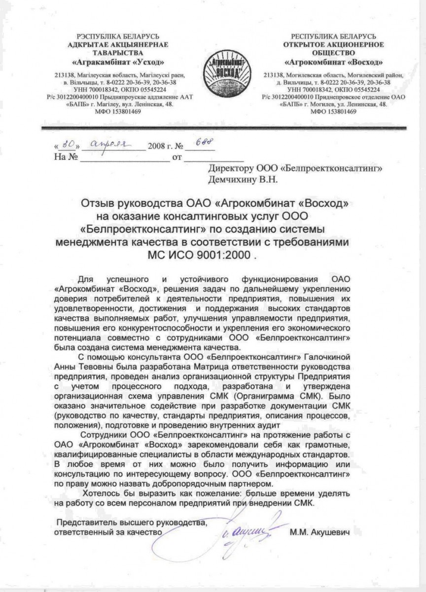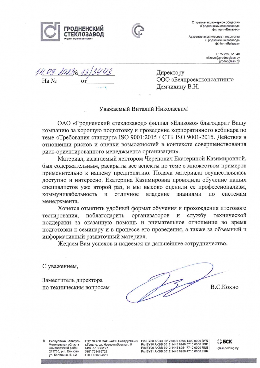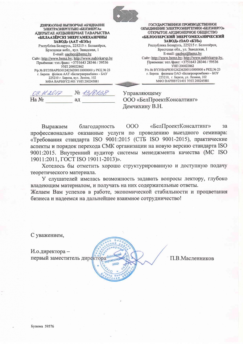 Выражаем благодарность ООО «БелПроектКонсалтинг» за профессионально оказанные услуги по проведению выездного семинара: «Требования стандарта ISO 9001:2015 (СТБ ISO 9001-2015), практические аспекты и порядок перехода СМК организации на новую версию стандарта ISO 9001:2015. Внутренний аудитор системы менеджмента качества (МС ISO 19011:2011, ГОСТ ISO 19011-2013».