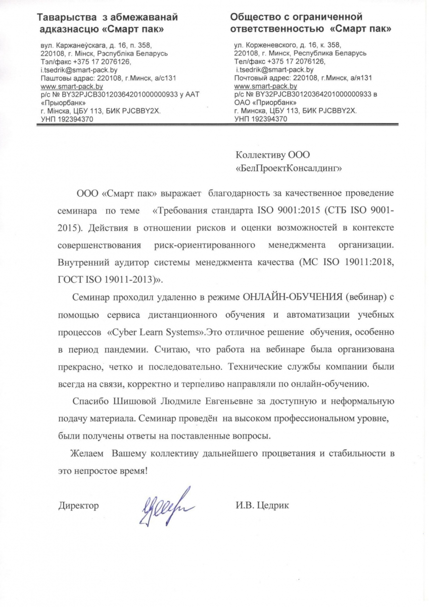 ООО «Смарт пак» выражает благодарность за качественное проведение семинара по теме«Требования стандарта ISO 9001:2015 (СТБ ISO 9001-2015). Действия в отношении рисков и возможностей в контексте совершенствования риск-ориентированного менеджмента организации. Внутренний аудитор системы менеджмента качества (MC ISO 19011:2018, ГОСТ ISO 19011-2013)».