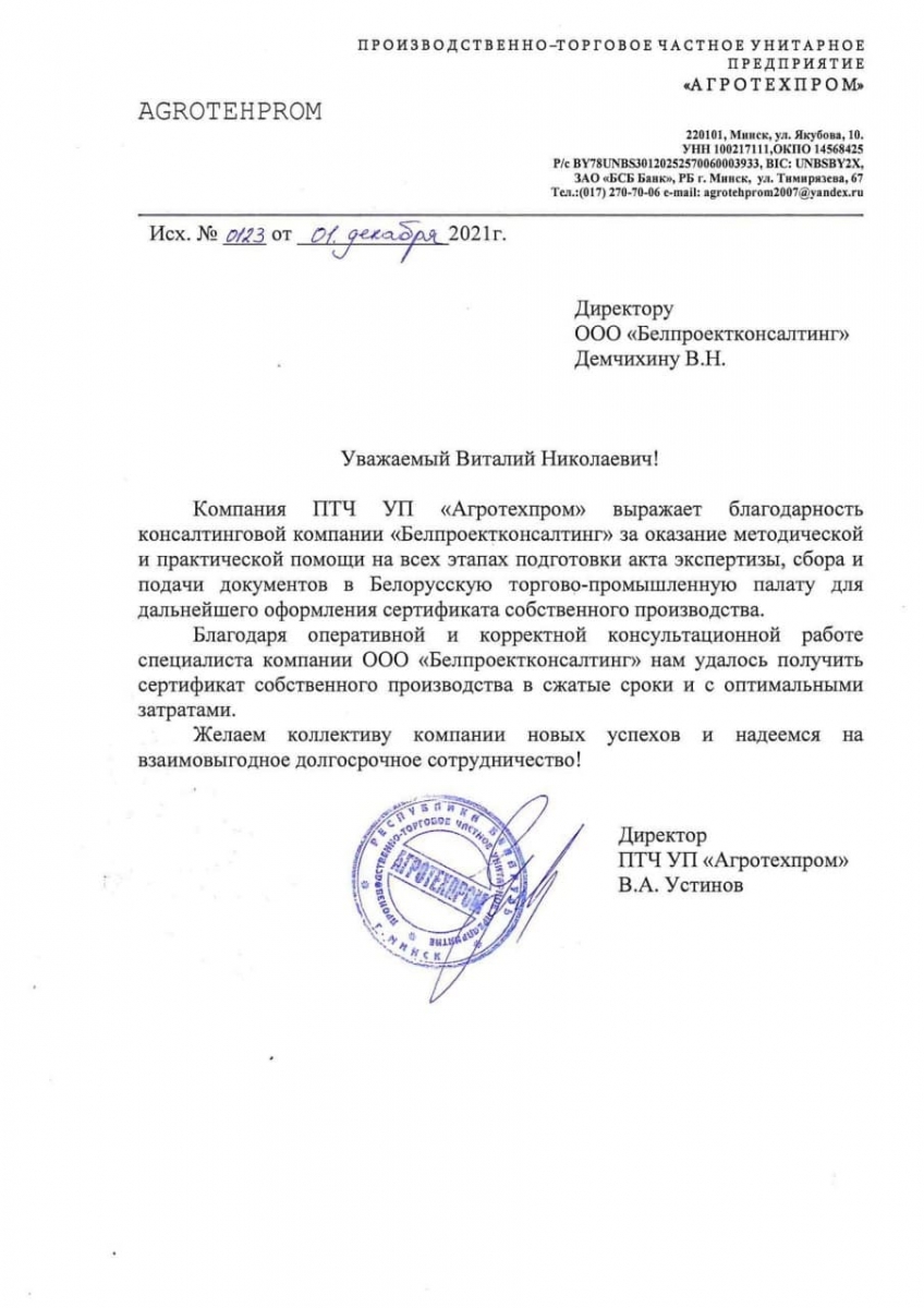 Управляющему консалтинговой компании ООО «Белпроектконсалтинг» Демчихину В.Н.