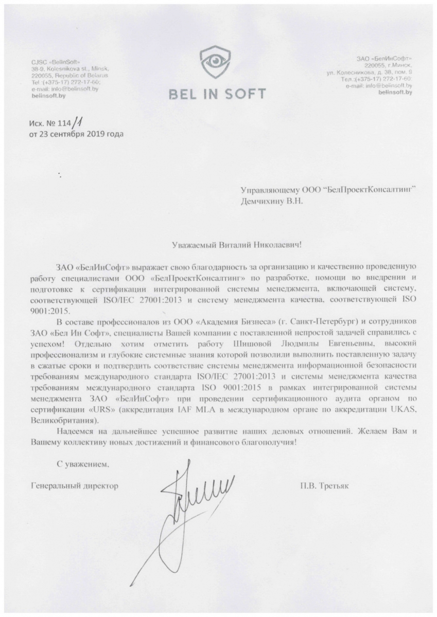 ЗАО «БелИнСофт» выражает свою благодарность за организацию и качественно проведенную работу специалистами ООО «БелПроектКонсалтинг» по разработке, помощи во внедрении и подготовке к сертификации интегрированной системы менеджмента, включающей систему, соответствующей ISOЛEC 27001:2013 и систему менеджмента качества, соответствующей ISO 9001:2015.