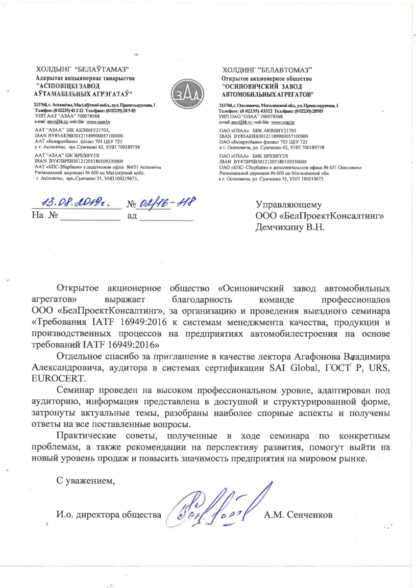 Открытое акционерное общество «Осиповичский завод автомобильных агрегатов» выражает благодарность команде профессионалов ООО «БелПроектКонсалтинг», за организацию и проведения выездного семинара «Требования IATF 16949:2016 к системам менеджмента качества, продукции и производственных процессов на предприятиях автомобилестроения на основе требований IATF 16949:2016»