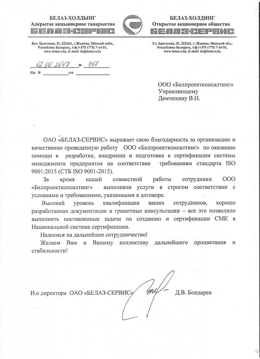 ОАО «БЕЛАЗ-СЕРВИС» выражает свою благодарность за организацию и качественно проведенную работу 000 «Белпроектконсалтинг» по оказанию помощи в разработке, внедрении и подготовке к сертификации системы менеджмента предприятия на соответствие требованиям стандарта ISO 9001:2015 (СТБ ISO 9001-2015).