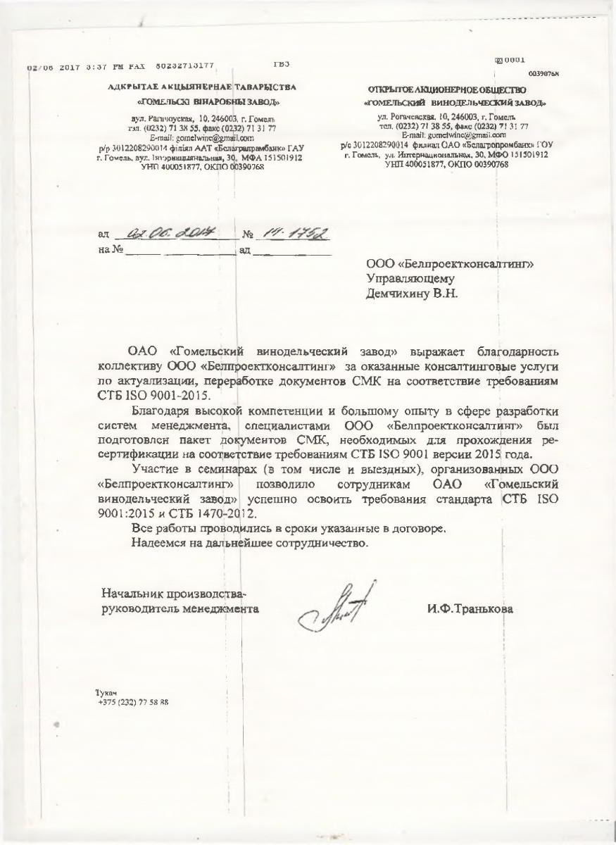 ОАО «Гомельский винодельческий завод» выражает благодарность коллективу ООО «Белпроектконсалтинг» за оказанные консалтинговые услуги по актуализации, переработке документов СМК на соответствие требованиям СТБ ISO 9001-2015.