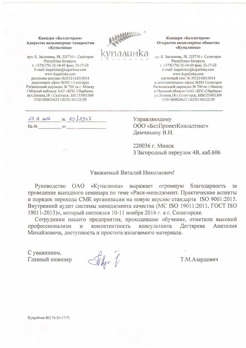 Руководство ОАО «Купалинка» выражает огромную благодарность за проведение выездного семинара по теме «Риск-менеджмент. Практические аспекты и порядок перехода СМК организации на новую версию стандарта ISO 9001:2015. Внутренний аудит системы менеджмента качества (МС ISO 19011:2011, ГОСТ ISO 19011-2013 )», который состоялся 10-11 ноября 2016 г. в г. Солигорске.