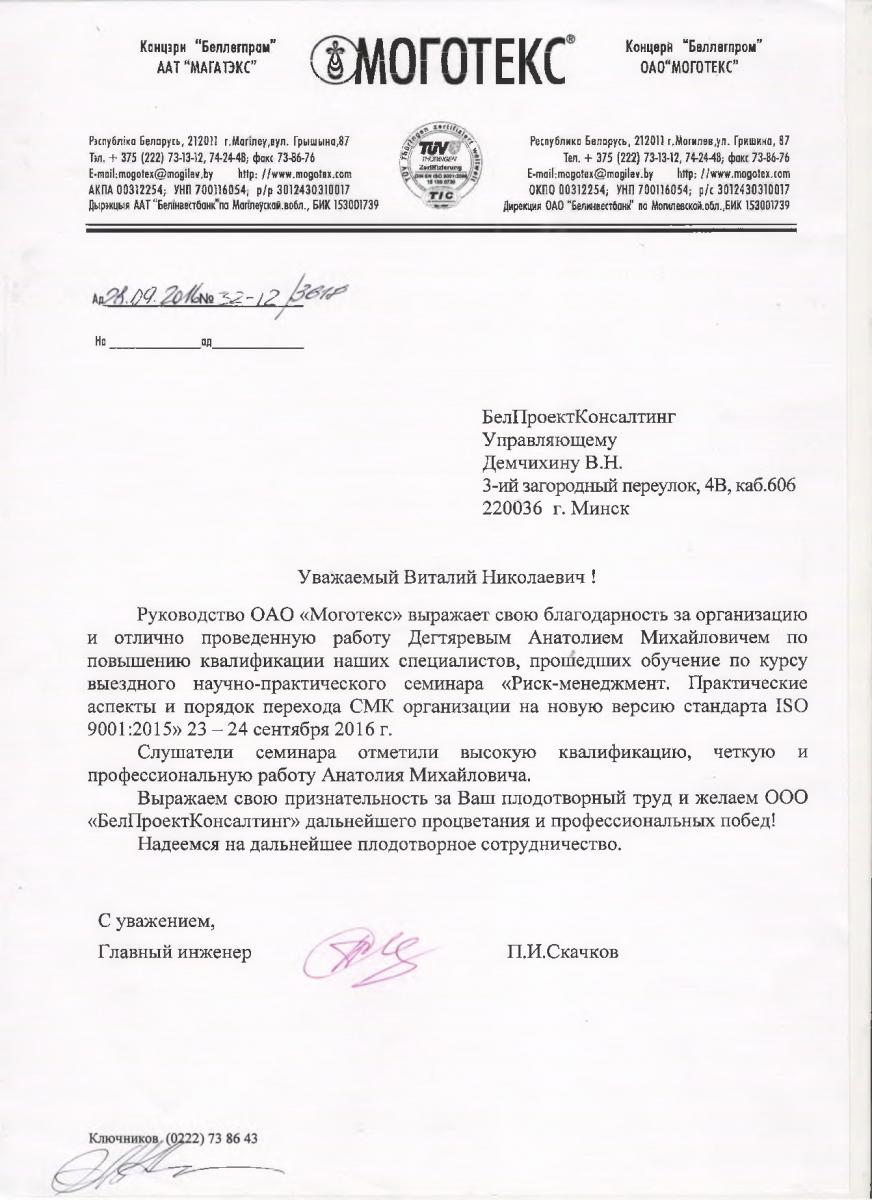 Руководство ОАО «Моготекс» выражает свою благодарность за организацию и отлично проведенную работу Дегтяревым Анатолием Михайловичем по повышению квалификации наших специалистов, прошедших обучение по курсу выездного научно-практического семинара «Риск-менеджмент. Практические аспекты и порядок перехода СМК организации на новую версию стандарта ISO 9001:2015» 23-24 сентября 2016 г.