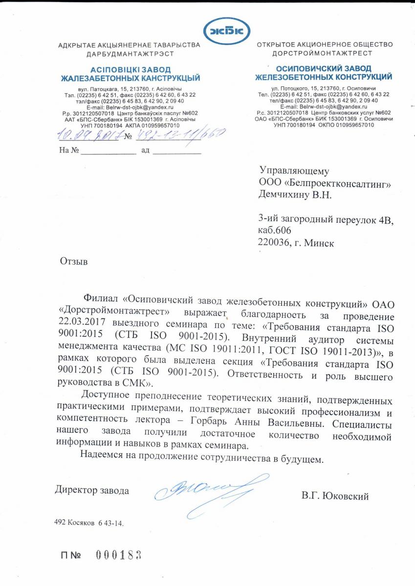 Филиал «Осиповичский завод железобетонных конструкций» ОАО «Дорстроймонтажтрест» выражает благодарность за проведение 22.03.2017 выездного семинара по теме: «Требования стандарта ISO 9001:2015 (СТБ ISO 9001-2015). Внутренний аудитор системы менеджмента качества (МС ISO 19011:2011, ГОСТ ISO 19011-2013)», в рамках которого была выделена секция «Требования стандарта ISO 9001:2015 (СТБ ISO 9001-2015). Ответственность и роль высшего руководства в СМК».