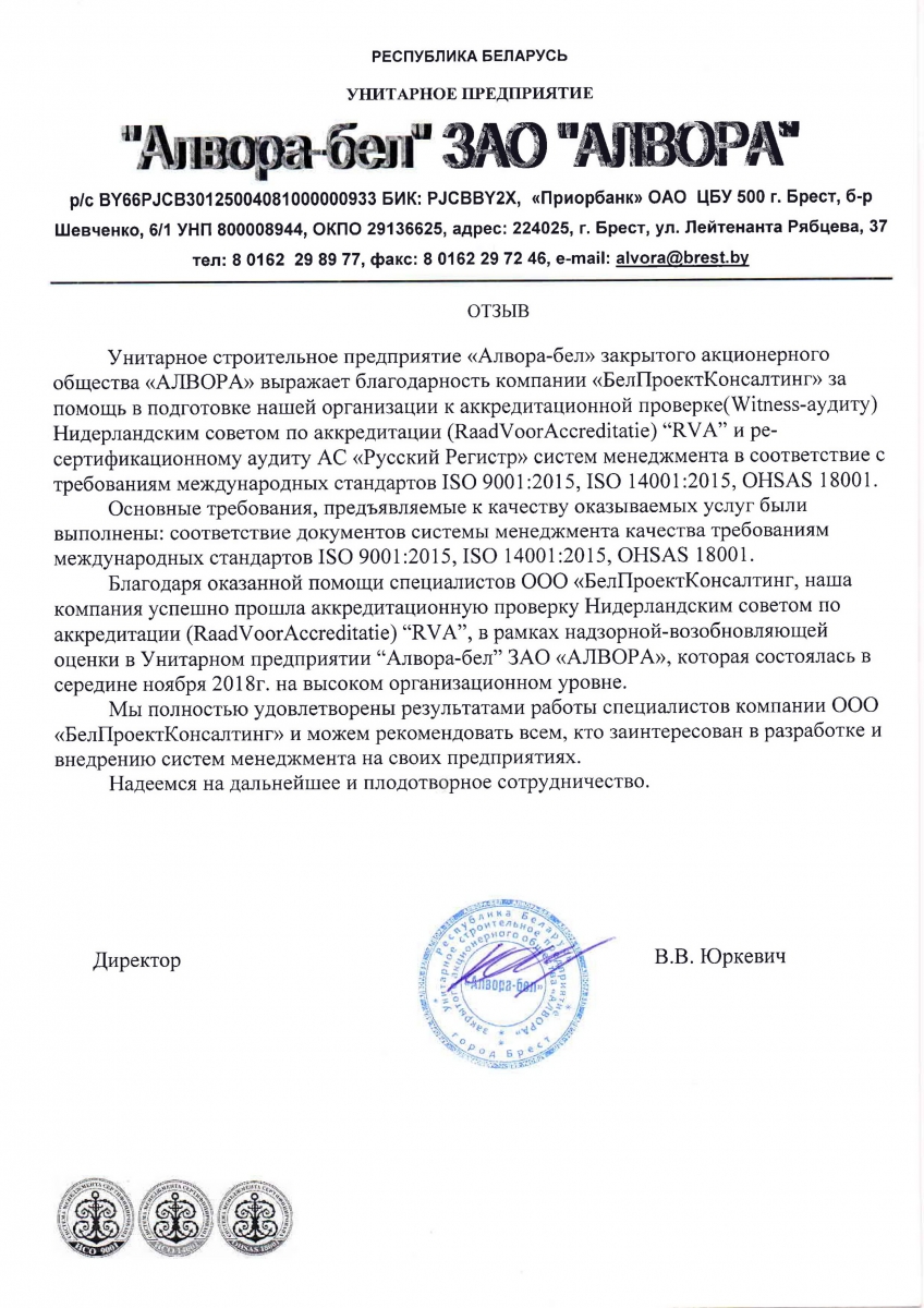 Унитарное строительное предприятие «Алвора-бел» закрытого акционерного общества «АЛВОРА» выражает благодарность компании «БелПроектКонсалтинг» за помощь в подготовке нашей организации к аккредитационной проверке( Witness-аудиту) Нидерландским советом по аккредитации (RaadvoorAccreditatie) “RVA” и ресертификационному аудиту АС «Русский Регистр» систем менеджмента в соответствие с требованиям международных стандартов ISO 9001:2015, ISO 14001:2015, OHSAS 18001.