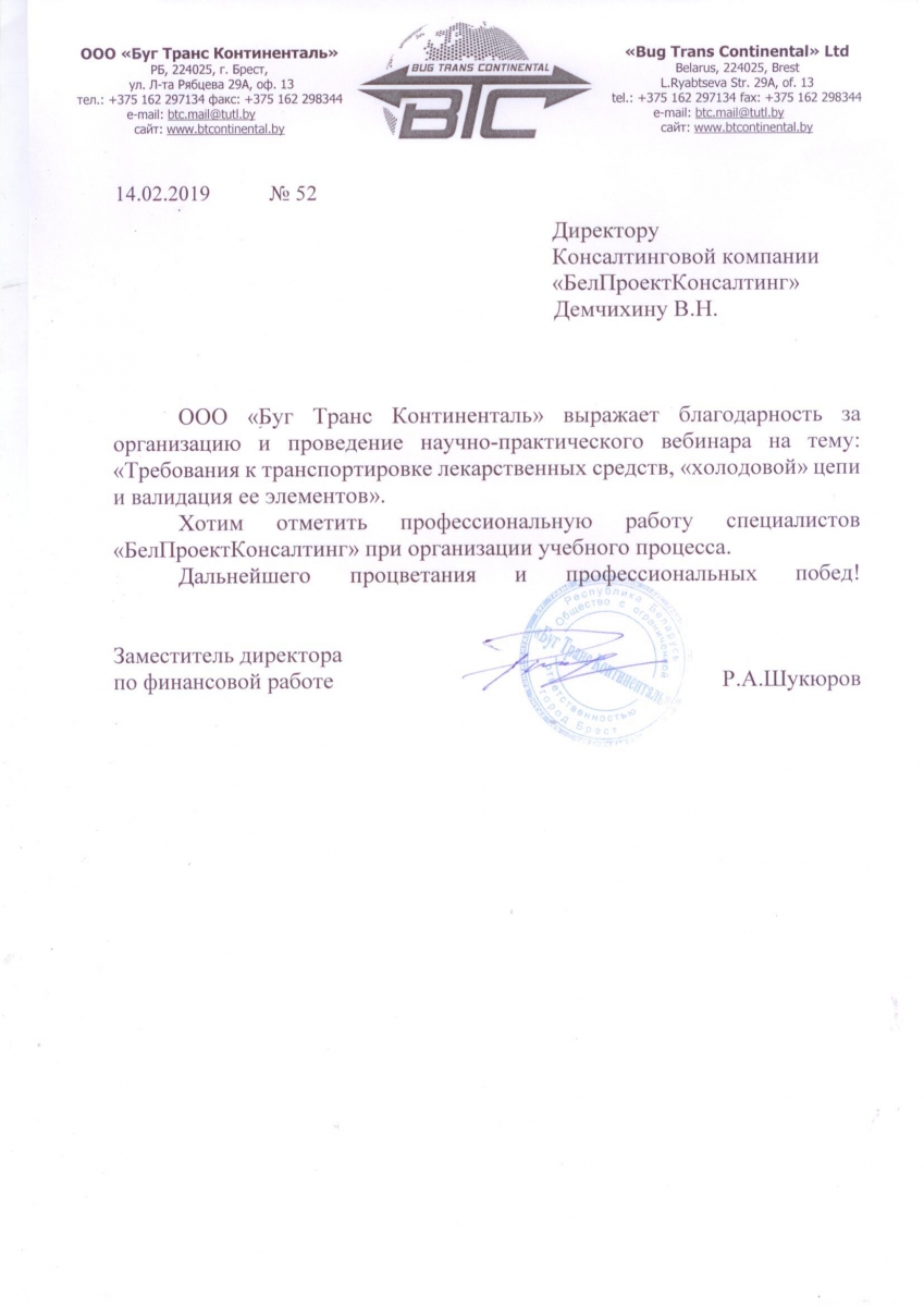 ООО «Буг Транс Континенталь» выражает благодарность за организацию и проведение научно-практического вебинара на тему: «Требования к транспортировке лекарственных средств, «холодовой» цепи и валидация ее элементов».