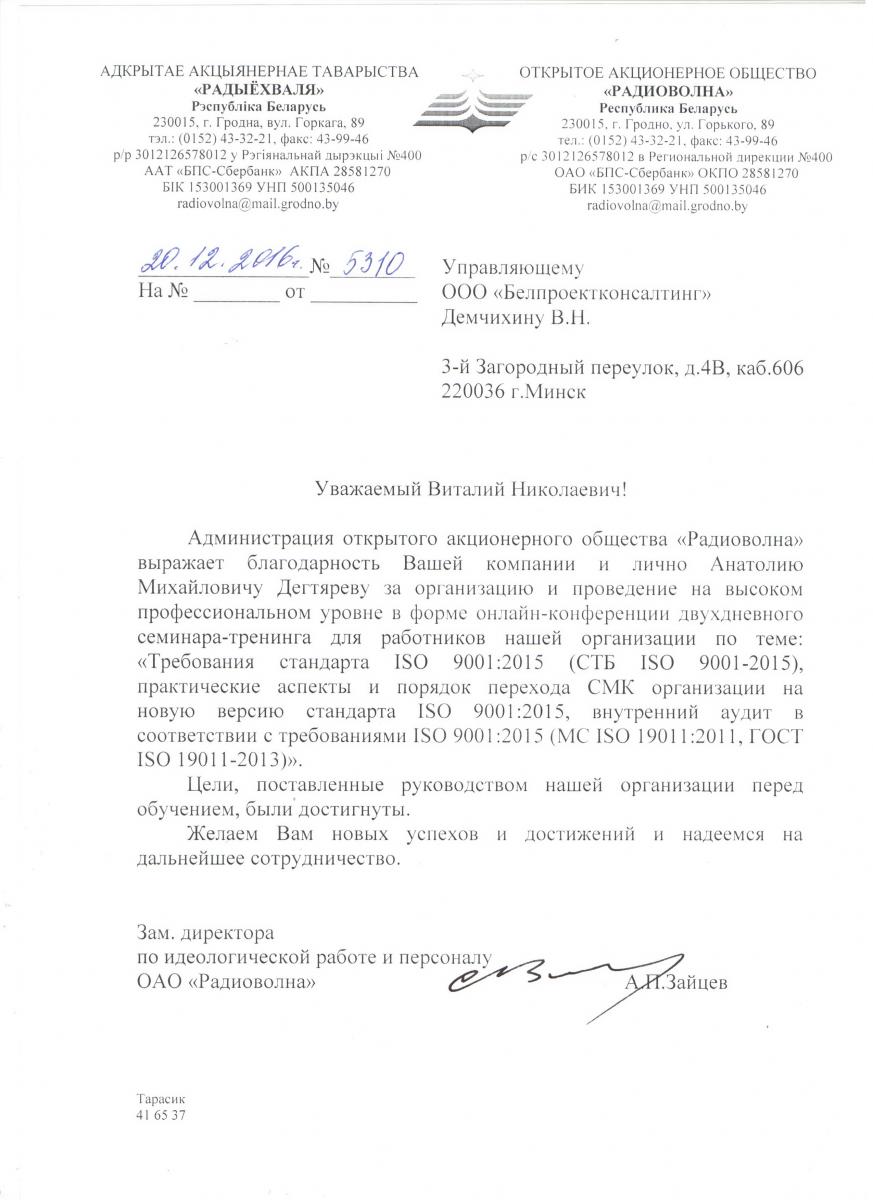 Администрация открытого акционерного общества «Радиоволна» выражает благодарность Вашей компании и лично Анатолию Михайловичу Дегтяреву за организацию и проведение на высоком профессиональном уровне в форме онлайн-конференции двухдневного семинара-тренинга для работников нашей организации по теме: «Требования стандарта ISO 9001:2015 (СТБ ISO 9001-2015), практические аспекты и порядок перехода СМК организации на новую версию стандарта ISO 9001:2015, внутренний аудит в соответствии с требованиями ISO 9001:2015 (МС ISO 19011:2011, ГОСТ ISO 19011-2013)».