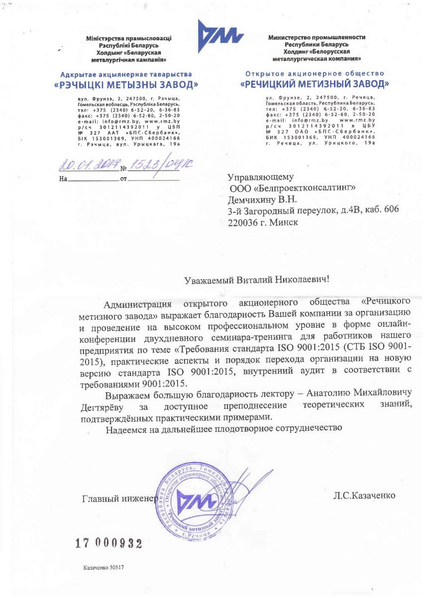 Администрация открытого акционерного общества «Речицкого метизного завода» выражает благодарность Вашей компании за организацию и проведение на высоком профессиональном уровне в форме онлайн конференции двухдневного семинара-тренинга для работников нашего предприятия по теме «Требования стандарта ISO 9001:2015 (СТБ ISO 90012015), практические аспекты и порядок перехода организации на новую версию стандарта ISO 9001:2015, внутренний аудит в соответствии с требованиями 9001:2015.