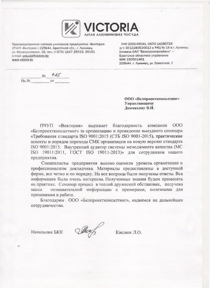ПЧУП «Виктория» выражает благодарность компании ООО «Белпроектконсалтинг» за организацию и проведение выездного семинара «Требования стандарта ISO 9001:2015 (СТБ ISO 9001-2015), практические аспекты и порядок перехода СМК организации на новую версию стандарта ISO 9001:2015. Внутренний аудитор системы менеджмента качества (МС ISO 19011:2011, ГОСТ ISO 19011-2013)» для сотрудников нашего предприятия.