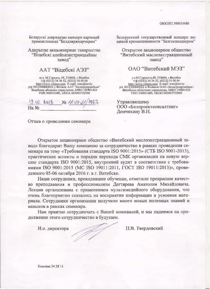 Открытое акционерное общество «Витебский маслоэкстракционный завод» благодарит Вашу компанию за сотрудничество в рамках проведения семинара на тему «Требования стандарта ISO 9001:2015» (СТЬ ISO 9001-2015), практические аспекты и порядок перехода СМК организации на новую версию стандарта ISO 9001:2015, внутренний аудит в соответствии с требованиями ISO 9001:2015 (МС ISO 19011:2011, ГОСТ ISO 19011:2013 )», проведенного 05-06 октября 2016 г. Вг. Витебске.